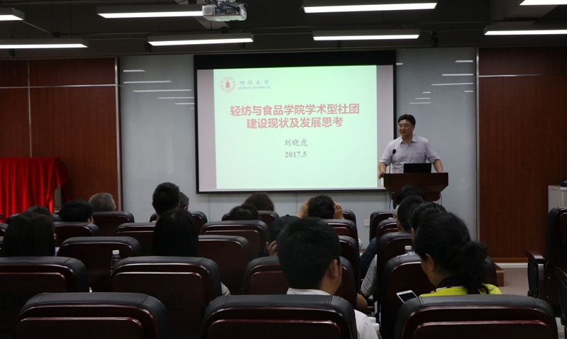 轻纺与食品学院党委副书记刘晓虎副教授代表学院做了题为“轻纺与食品学院学术型社团建设现状及发展思考”的工作汇报,着重从学院学术型社团的发展背景、建设现状及未来发展的思考等几个方面做了详细的介绍。刘晓虎副书记首先介绍了学术型社团规模发展情况,针对学院师生对学术型社团活动的参与情况、学术型社团各类活动的组织开展、学术型社团对学院创新创业情况的影响进行了详细的阐述,通过对比近两年来学院立项的大创项目的增长率和学术型社团在学院立项的大创项目增长率,提出学院学术型社团已由数量发展正在向质量发展进行过渡。刘晓虎副书记对社团工作的管理模式、发展动力、社团建设数量和发展质量、学术型社团建设与教学科研融入的问题做出了思考与汇报,并提出学院未来要将学术型社团的建设作为专业教育的重要抓手,要将学术型社团建设与专业教师的教学与科研融合起来。