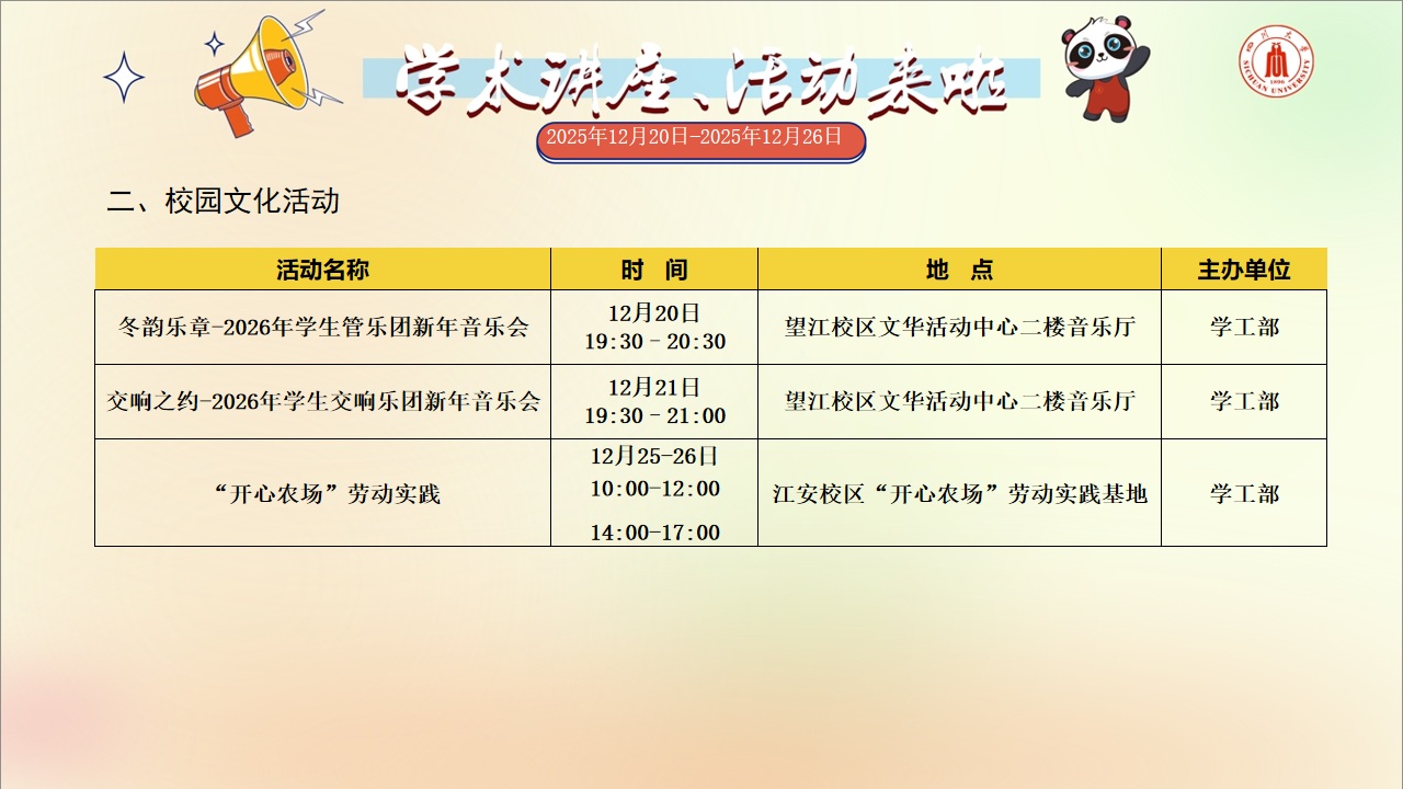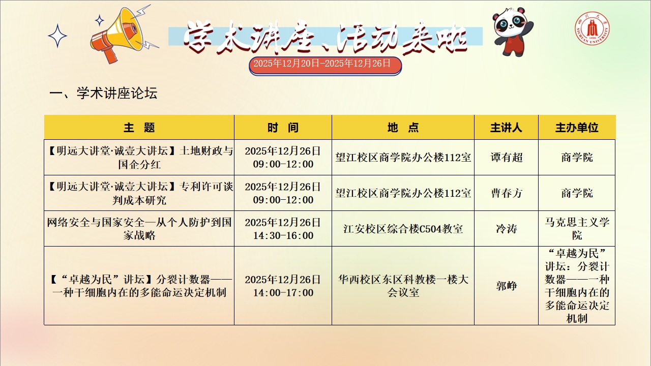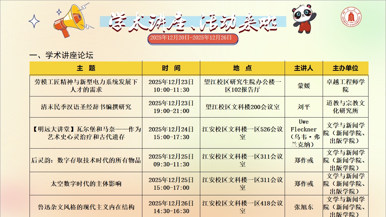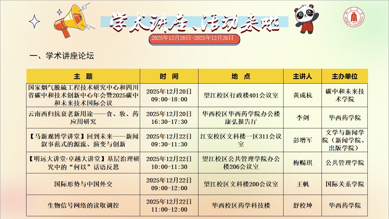 学术讲座和91黑料 活动预告(2025年12月20日-2025年12月26日)
