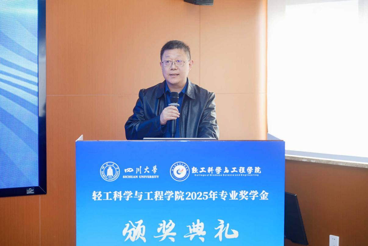 11月28日下午,轻工科学与工程学院2025年专业奖学金颁奖典礼在皮革楼互联网中心举行。中国皮革协会副理事长陈占光、德国司马化学有限公司皮革部中国区总经理张建华、斯塔尔精细涂料有限公司皮革事业部中国区区域销售经理涂刚、天津春发生物科技集团有限公司项目经理董婷等企业嘉宾,学院党委书记李天富、院长彭必雨,副院长周建飞、迟原龙等院领导,生物质与皮革工程系系主任林炜、副系主任程海明,食品工程系系主任吕远平等,与全体获奖师生共同参加典礼。学院党委副书记姜新主持。